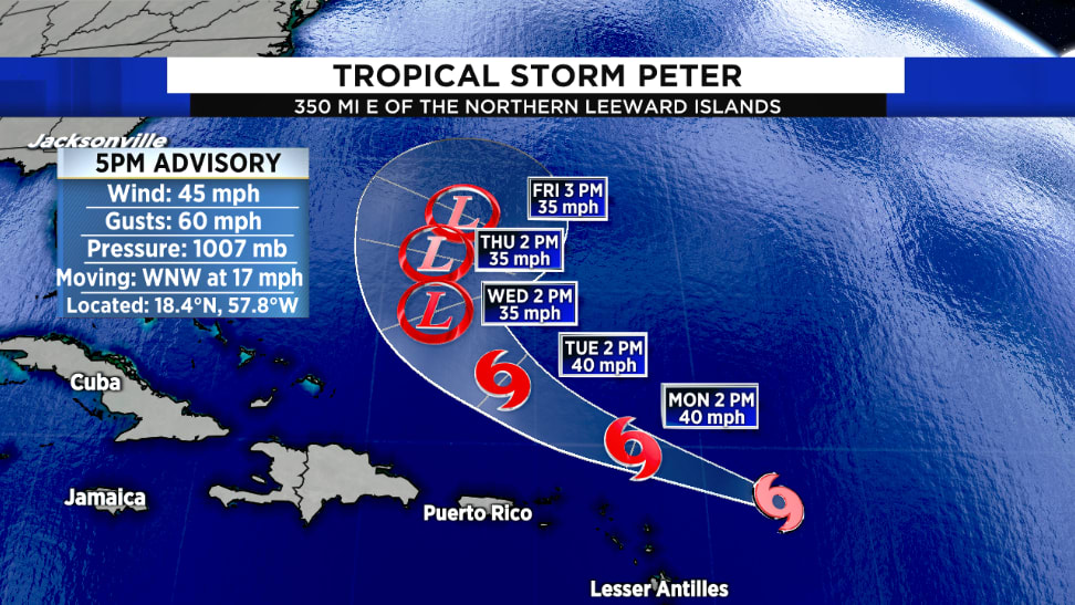 Rainfall around the southern periphery of Tropical Storm Peter may lead to areas of urban and small stream flooding through Tuesday across northern Hispaniola Puerto Rico the Virgin Islands and. Track Tropical Storm Peter 2021. Peter was slightly stronger on Monday and had winds up to 50 mph.